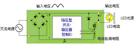 羅姆為了適應上述市場需求而在進行LED照明用驅(qū)動器IC的開發(fā)。為使LED保持一定的亮度點燈,需要有進行恒流控制的LED驅(qū)動器IC。通常,是從交流電源開始進行恒流控制,所以使用降壓型開關穩(wěn)壓器方式(圖1)。