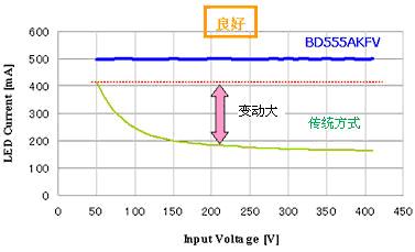 傳統(tǒng)方式中,輸入電壓變動和輸出電壓變動大,須根據(jù)應用條件重新設計電源模塊。如果輸入電壓變動大,則交流電壓頻率(全波整流后為100Hz~120Hz)中帶紋波的輸入電壓會使得LED的亮度發(fā)生閃爍。為了穩(wěn)定輸入電壓,必須在設計電源模塊時采取措施。如果輸出電壓變動大,就必須針對每一個光源的輸出電壓(LED的燈數(shù))變更外接元器件的常數(shù),設計出許多種電源模塊來,從而增加了設計工作量(圖2)。