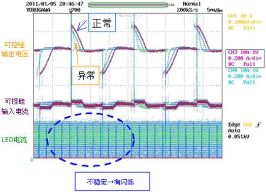 可控硅調(diào)光器在可控硅處于導通狀態(tài)時必須使保持電流持續(xù)流通;一旦保持電流下降,可控硅便關斷了。由于LED照明燈與原有照明燈相比,功耗極低,所以使可控硅的保持電流下降,調(diào)光器就往往會因此而不定期關斷從而發(fā)生閃變(閃爍)現(xiàn)象。(圖5)