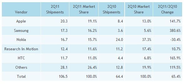 IDC最新市場(chǎng)報(bào)告指出,2011年第二季智能手機(jī)市場(chǎng)表現(xiàn)亮眼,出貨量從去年同期的6440萬支成長至1.065億支,成長了65.4%。而蘋果市占率達(dá)19.1,居市場(chǎng)首位,其后分別是三星、諾基亞、RIM與HTC宏達(dá)電。