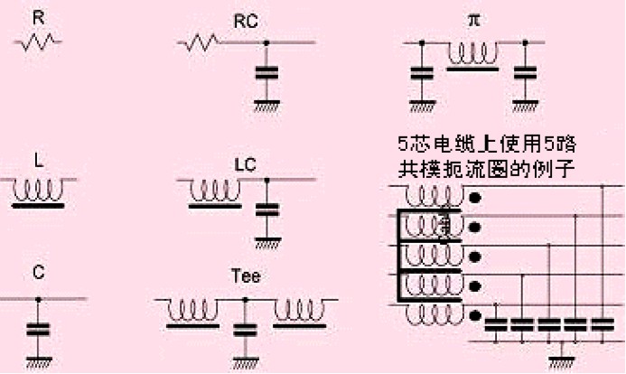 低頻模擬信號中使用的濾波器,尤其是當(dāng)電子電路的靈敏度非常高時,需要采用如電源線濾波器一樣的單級或多級電路。然而,在多數(shù)情況下,信號是數(shù)字化的或高電平模擬信號,對干擾不很敏感,因此可采用R、L、C、RC、LC、T、或π型濾波器,如圖4所示。