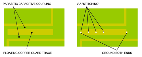 填充地也稱為保護(hù)線,通常將其用于電路中很難鋪設(shè)連續(xù)接地區(qū)域或需要屏蔽敏感電路的設(shè)計(jì)(圖10)。通過在引線兩端,或者是沿線放置接地過孔(即過孔陣列),增大屏蔽效應(yīng)。請不要將保護(hù)線與設(shè)計(jì)用來提供返回電流通路的引線相混合,這樣的布局會引入串?dāng)_。