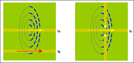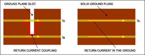 直流電流總是傾向于沿著低阻通路流通。同理,高頻電流也是優(yōu)先流過最低電阻的通路。所以,對于地層上方的標(biāo)準(zhǔn)PCB微帶線,返回電流試圖流入引線正下方的接地區(qū)域。按照上述引線耦合部分所述,割斷的接地區(qū)域會引入各種噪聲,進(jìn)而通過磁場耦合或匯聚電流而增大串?dāng)_(圖9)。