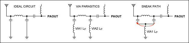 Maxim ISM-RF產(chǎn)品的數(shù)據(jù)資料往往建議使用盡可能短的高頻輸入、輸出引線,從而將損耗和輻射降至最小。另一方面,這種損耗通常是由于非理想寄生參數(shù)引起的,所以寄生電感和電容都會影響電路布局,使用盡可能短的引線有助于降低寄生參數(shù)。通常情況下,10 mil寬、距離地層0.0625in的PCB引線,如果采用的是FR4電路板,則產(chǎn)生大約19nH/in的電感和大約1pF/in的分布電容。對于具有20nH電感、3pF電容的LAN/混頻器電路,電路、元器件布局非常緊湊時(shí),會對有效元件值造成很大影響。