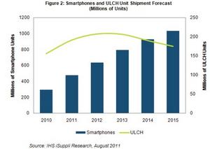 下圖所示為2010-2015年智能手機(jī)與ULCH單位出貨量預(yù)測。