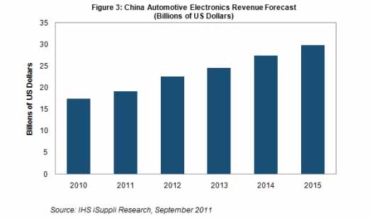 據IHS iSuppli公司的中國研究報告,2011年中國汽車電子市場銷售額預計將達到192億美元,比去年的175億美元增長9.7%。