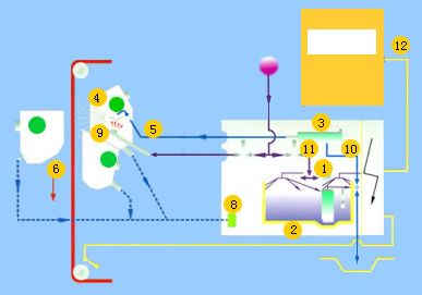 其工藝過程如圖3所示,泵①抽取液槽②的液體或水,通過過濾器③輸送到噴盤架⑤上各種噴盤④中;當平幅運行的織物⑥通過時,液體便噴射其上;末被噴射到織物上的液體則通過回流管⑦流回到液槽;通過預過濾器⑧清除回流液體中的雜質(zhì);清洗裝置⑨⑩⑾保證了供液體單元的清洗,控制單元⑿控制整個裝置。