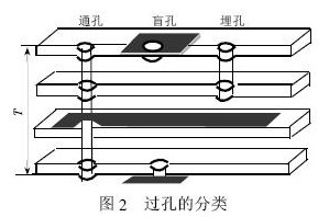 通孔,這種孔穿過整個線路板,可用于實現(xiàn)內(nèi)部互連或作為元件的安裝定位孔。由于通孔在工藝上更易于實現(xiàn),成本較低,所以一般印制電路板均使用通孔。過孔的分類如圖2 所示。