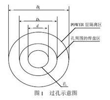 過孔是多層PCB 設(shè)計中的一個重要因素,一個過孔主要由三部分組成,一是孔;二是孔周圍的焊盤區(qū);三是POWER 層隔離區(qū)。過孔的工藝過程是在過孔的孔壁圓柱面上用化學(xué)沉積的方法鍍上一層金屬,用以連通中間各層需要連通的銅箔,而過孔的上下兩面做成普通的焊盤形狀,可直接與上下兩面的線路相通,也可不連。過孔可以起到電氣連接,固定或定位器件的作用。過孔示意圖如圖1 所示。