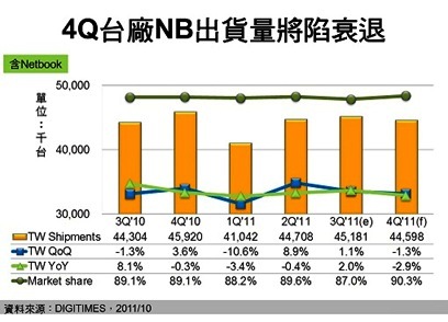9月部分品牌NB出貨雖見回溫,但主因是庫存過低回補(bǔ),非因市場需求回升所致。簡佩萍預(yù)估,第三季的低迷市況,將延續(xù)至第四季,年成長率也將再度陷入衰退。而因惠普訂單從偉創(chuàng)力回流至臺廠,雖使得第四季臺廠占全球NB出貨量比重提升至90.3%,但2011年臺廠將僅有第三季的NB出貨量年成長率為正。