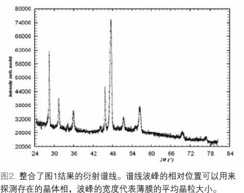 相分析要求事先了解感興趣的相。一種自動化的峰擬合算法用來獲得曲線中每一個峰的位置和強度值。將實驗峰值的位置與感興趣相的譜線作對比,來確定該相是否存在。另外,曲線中不能被匹配的峰意味著更多的相存在。例如在圖2中,如果取樣程式認為在測量的硅片上只存在鎳單硅化物,盡管事實上相的鑒定需要手工完成,但多余的峰(來自于NiSi2)仍然會被軟件標(biāo)記。為了測量不同相的比例,一種針對多相系統(tǒng)的應(yīng)用遵循了這樣的原理,即一個獨立相衍射峰的強度(一級近似)與薄膜中對應(yīng)相的數(shù)量成比例。