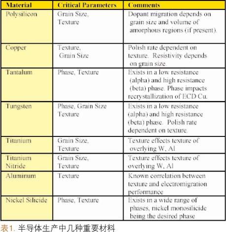 表1總結(jié)出半導(dǎo)體生產(chǎn)中可以通過X射線衍射量測的多晶材料。幾種有代表性的應(yīng)用技術(shù)在下面詳細列出。