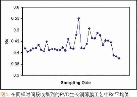 這種設(shè)備最初的一種應(yīng)用是監(jiān)測一系列物理氣相淀積(PVD)的反應(yīng)腔,這些反應(yīng)腔在銅互連金屬化制程中被用來淀積TaN/Ta/Cu襯墊層和籽晶層。這種監(jiān)測作為標(biāo)準(zhǔn)的平面電阻,膜厚量測的補充而存在。薄膜堆棧中Ta和Cu成分的織構(gòu)強度和譜線展寬數(shù)據(jù)都需要收集。TaN層具有無定形結(jié)構(gòu),因此無法監(jiān)測。圖3說明了一個從銅元素峰寬控制圖表中輸出的例子。數(shù)據(jù)的趨勢穩(wěn)步向上,表明PVD銅籽晶的平均晶粒大小隨著時間在減小。圖4說明了在相應(yīng)的Rs圖表中類似但并不十分顯著的增加。隨后的設(shè)備診斷發(fā)現(xiàn)受影響的反應(yīng)腔一個閥門有空氣泄漏的現(xiàn)象。泄漏影響到濺射工藝,進而影響銅籽晶層的淀積,這一過程極有可能是在淀積和淀積之后的自退火過程中,由于銅在Ta表面的遷移率下降造成。更換了閥門之后,Rs和銅元素峰寬的值都變小,我們從圖3和圖4控制圖表中的最后三個數(shù)據(jù)點可以看出。