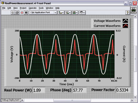 功率損耗的更精確描述可以通過(guò)測(cè)量設(shè)備的真實(shí)功率,或“近似功率”獲得,這種測(cè)量必須考慮信號(hào)的波形和相位。分析真實(shí)功率的方法之一是使用兩臺(tái)同步的PXI-4071 FlexDMM設(shè)備,每臺(tái)都具有采集電壓和電流波形速率高達(dá)1.8Ms/s的能力,并提供標(biāo)準(zhǔn)DMM的讀數(shù)方式。