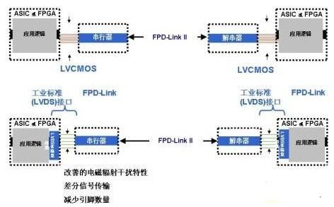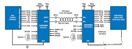 一旦接收器PLL鎖定在發(fā)射器的頻率下,即可由LOCK輸出標(biāo)志引腳顯示這一狀態(tài),確保接收器輸出的數(shù)據(jù)完整性。DS90UR907/8芯片組具有DS90UR905/6芯片組的一切特性,兩耳區(qū)別在于輸入輸出不再是發(fā)送LVCMOS信號(hào)的并行總線,而是遵照開放的工業(yè)標(biāo)準(zhǔn)"FPD-Link"。很多現(xiàn)代化的圖像控制器、顯示定時(shí)控制器、ASIC和FPGA都支持這種"一級(jí)串行化"技術(shù),它采用適合18bpp的3個(gè)數(shù)據(jù)通道,或者適合24bpp的4個(gè)數(shù)據(jù)通道,每一個(gè)都有一路并行時(shí)鐘通道。電信號(hào)的發(fā)送遵循開放的ANSI/TIA/EIA-644A標(biāo)準(zhǔn),該標(biāo)準(zhǔn)又稱作"LVDS"(低壓差分信號(hào)傳輸)。使用該接口技術(shù)代替常規(guī)LVCMOS的優(yōu)勢(shì)在于:采用差分信號(hào)可降低電磁干擾,并減少組件的引腳數(shù)量,如圖3所示。