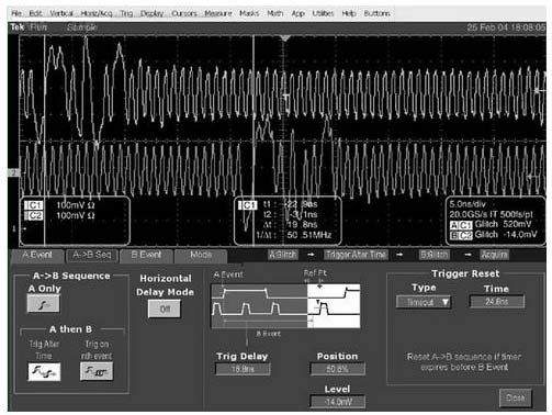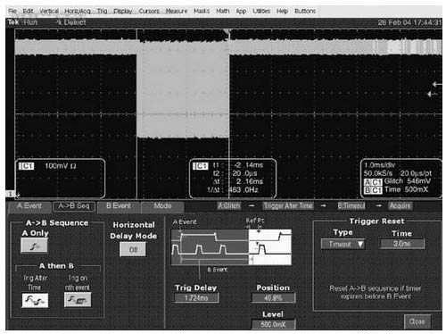 在這一過程中,A事件啟動延遲計數(shù)器,計算脈沖數(shù)量。一旦產(chǎn)生了32個脈沖,它會使B觸發(fā)器監(jiān)測第33個脈沖。當檢測到特定脈寬時,B系統(tǒng)便設(shè)成觸發(fā)采集,這時,示波器觸發(fā)并記錄數(shù)據(jù)。如果沒有第33個脈沖,復(fù)位條件會重新準備A觸發(fā)器,再次啟動整個流程。