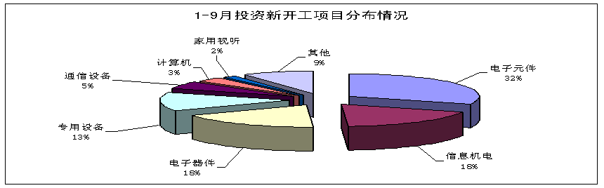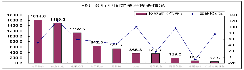 前三季度,電子信息產(chǎn)業(yè)500萬(wàn)元以上項(xiàng)目完成固定資產(chǎn)投資6492億元,投資額超過去年全年水平近500億元,同比增長(zhǎng)62.4%,增速高于工業(yè)投資35.9個(gè)百分點(diǎn)。其中9月份完成投資889.6億元,同比增長(zhǎng)35.6%,增速比8月下降35.2個(gè)百分點(diǎn),這是今年以來第二個(gè)月月度投資增速低于60%。