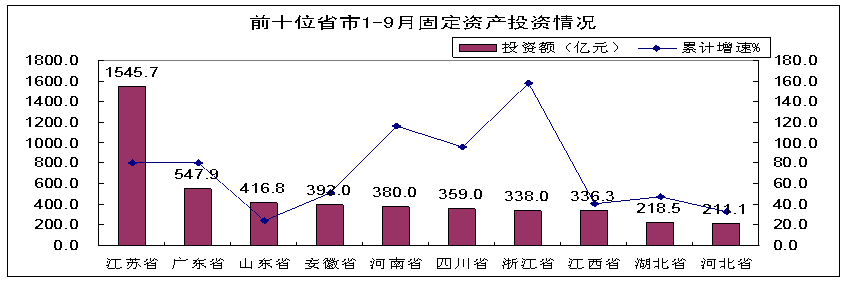 前三季度,東部10省市完成投資3825億元,同比增長(zhǎng)74.9%,增速高于去年同期26.3個(gè)百分點(diǎn);江蘇、廣東、浙江、北京投資上升較快,增速均超過80%,特別是江蘇省完成投資1546億元,占全國(guó)總投資的近四分之一。中部6省完成投資1557億元,同比增長(zhǎng)60%,其中安徽、河南投資增長(zhǎng)突出,分別居全國(guó)第四、五位,增長(zhǎng)51.2%和116.4%。西部12省市完成投資836億元,同比增長(zhǎng)53.5%,其中四川省投資359億元,占西部地區(qū)的43%,同比增長(zhǎng)95.4%。東北三省完成投資274億元,同比下降6.2%。