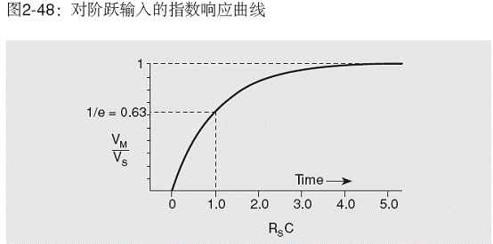 這樣就得到了圖2-48所示的熟悉的指數(shù)曲線。要獲得準(zhǔn)確的讀數(shù)就必須等待4到5倍時(shí)間常數(shù)的時(shí)間。在大數(shù)值電阻和電容的情況下,上升時(shí)間可能達(dá)到數(shù)分鐘。加大并聯(lián)電容雖然增加了上升時(shí)間,但是由于降低了電壓表的有效帶寬,所以就濾掉了由源和互連電纜產(chǎn)生的噪聲。