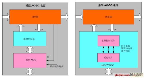 傳統(tǒng)開關(guān)電源(Switch Mode Power Supply,SMPS)控制通常使用純模擬技術(shù)。低成本和高性能數(shù)字信號控制器(Digital Signal Controller, DSC)的出現(xiàn)開啟了開關(guān)電源控制的全新境界,并且標志著電源產(chǎn)業(yè)正朝著數(shù)字革命的方向發(fā)展。