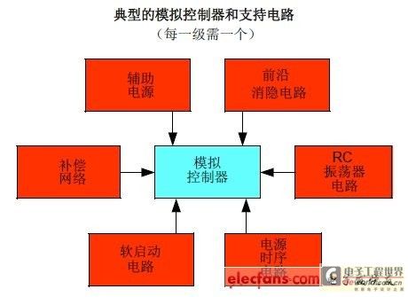 圖1和圖2僅從較高層次展示了兩者的主要差別;然而,在進行對比時所有支持電路也需包括在內(nèi)。圖3 所示為每個模擬級中的支持電路,而圖4 則為數(shù)字系統(tǒng)中的支持電路。注意模擬控制器所需要的額外連接(在圖3 和圖4 中用箭頭標出)。