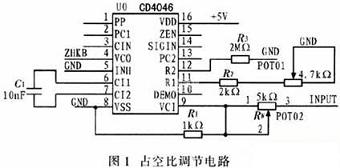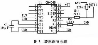 圖3為頻率調(diào)節(jié)電路。通過調(diào)節(jié)CD4046外接電位器POTll,控制VCO輸出脈沖的頻率,根據(jù)設(shè)計(jì)要求,該電路將輸出一個(gè)變化范圍在1~6 kHz之間的脈沖信號(hào)PLS,將該信號(hào)作為CPLD的輸入信號(hào)。在CPLD內(nèi)部通過計(jì)數(shù)延時(shí)和占空比設(shè)計(jì)要求,最終輸出一個(gè)頻率在400~3 000 Hz之間符合占空比要求的逆變觸發(fā)信號(hào),并可通過POT11調(diào)節(jié)該信號(hào)的頻率。