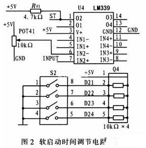 圖2為軟啟動(dòng)時(shí)間調(diào)節(jié)電路。該電路單元是將調(diào)節(jié)器輸出信號(hào)作為電壓比較器LM339的輸入信號(hào),此信號(hào)是一個(gè)在0~5 V之間變化的直流電壓信號(hào)(即INPUT信號(hào))。按照設(shè)計(jì)要求,LM339的引腳6給定電壓為1 V,當(dāng)INPUT信號(hào)的電壓大于l V時(shí),LM339的引腳l通過上拉電阻輸出一個(gè)高電平作為啟動(dòng)信號(hào)送入CPLD。在CPLD內(nèi)部通過調(diào)節(jié)外部的撥段開關(guān)控制比較器的輸出,從而控制軟啟動(dòng)的時(shí)間。