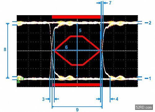 通過在示波器的垂直軸對數(shù)字信號進(jìn)行反復(fù)采樣、同時采用相應(yīng)數(shù)據(jù)率對水平時間掃描進(jìn)行觸發(fā)來生成眼圖。所獲得的圖形看上去象眼睛,如圖1所示。“眼睛”越大,數(shù)據(jù)完整性越高。通常采用模板(mask)來對可接受的信號質(zhì)量進(jìn)行定義。這模板由“眼睛”中間的六角形和“眼睛”上、下的矩陣組成。如果測得的信號跡線穿越模板的邊線,那么信號質(zhì)量就不可接受。USB2.0信號模板規(guī)范由USB應(yīng)用者論壇(USBIF,www.usb.org)提供,可參見USB2.0版規(guī)范第7.1.2.2章節(jié)。圖1中顯示了帶有詳細(xì)臨界點的眼圖。