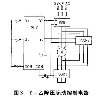 圖3為PLC控制的Y-△降壓起動控制電路,其中X1、X2分別表示PLC的輸入,控制電動機的起停;Y1、Y2、Y3表示PLC的輸出。當Y1和Y3有效時,對應的SSR1和SSR3也同時有效,此時電動機為Y型接法,延時幾秒后,Y3失效,Y2有效,則對應的SSR3三相輸出端斷開,SSR2三相輸出端合上,則電動機變?yōu)椤鹘臃?,完成了Y一△降壓起動。