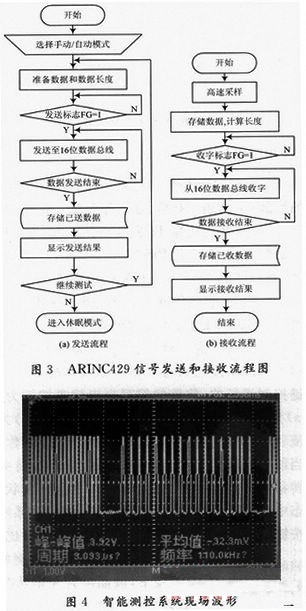 對(duì)此便攜式低功耗雷達(dá)導(dǎo)航儀智能測(cè)控系統(tǒng)的測(cè)試內(nèi)容包括:發(fā)送數(shù)據(jù)、接收數(shù)據(jù)和發(fā)送數(shù)據(jù)間隔等測(cè)試。由于HS3282的兩路輸出是差分輸出的,所以只需要測(cè)試其中的一路就可以了。智能測(cè)控系統(tǒng)現(xiàn)場(chǎng)波形如圖4所示,發(fā)送的數(shù)據(jù)采用自動(dòng)模式,控制字為奇校驗(yàn)。通過示波器直接觀察HS3282芯片的輸出信號(hào),輸出電平是3.92 V,滿足TTL的電平要求。而數(shù)據(jù)之間的時(shí)間間隔,即組間數(shù)據(jù)4位間隔。由單片機(jī)的延時(shí)程序即可完成。
