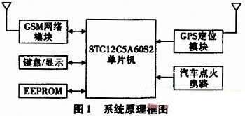 當車主離開車輛時,即可啟動防盜系統(tǒng),首先車主需設置手機號,以備接收車輛的定位信息,此時,單片機控制GPS模塊,不斷獲取GPS定位數(shù)據,并對獲取的GPS數(shù)據進行分析,從而獲取包括車輛的經、緯度以及速度等信息。系統(tǒng)通過車輛的速度或經、緯度的變化來判斷車輛是否被移動,如果車輛被非法移動,單片機將控制GSM模塊將車輛的定位信息通過短消息,以每間隔十分鐘時間發(fā)送到車主指定的手機中,同時,單片機將此信息存儲在EEPROM中,以做將來的證據使用。車主第一時間知道車輛位置后,即可通過GSM遠程網絡控制防盜系統(tǒng),切斷車輛的點火電路,使車輛熄火。同時,車主將車輛定位信息提供給警方,盡快找回自己的車輛。系統(tǒng)工作原理框圖見圖1。