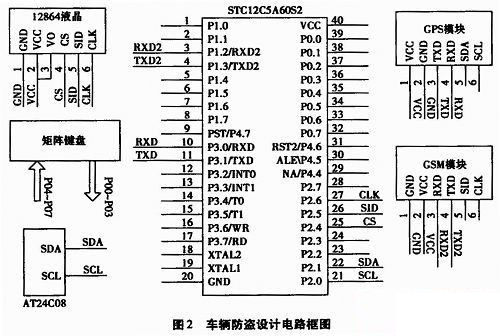 人機接口包括矩陣鍵盤和液晶顯示部分,主要用于實現(xiàn)預置的手機號碼的輸入、顯示和防盜功能的開啟與關閉功能。存儲器采用HC總線的EEPROM AT24C08,其為非易失性存儲器,存儲的數(shù)據可保存100年以上,并可進行上萬次擦寫。單片機將GPS上接收來的數(shù)據進行解析后,所獲得的車輛所處的經、緯度,速度等信息保存在該存儲器中,為以后做為公安機關的證據依據。
