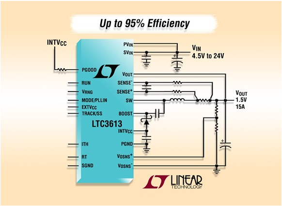 凌力爾特公司 (Linear Technology Corporation) 推出高頻、接通時(shí)間受控的同步降壓型 DC/DC 轉(zhuǎn)換器 LTC3613,該器件具差分輸出電壓采樣和時(shí)鐘同步。受控的接通時(shí)間和谷值電流模式架構(gòu)在瞬態(tài)事件時(shí)可通過(guò)提高工作頻率以實(shí)現(xiàn)非常快速的瞬態(tài)響應(yīng),從而允許 LTC3613 僅在幾個(gè)時(shí)鐘周期內(nèi)就可從大的負(fù)載步進(jìn)中恢復(fù)。其 4.5V 至 24V 的輸入范圍支持多種應(yīng)用,其中包括大多數(shù)中間總線(xiàn)電壓。集成的 N 溝道 MOSFET 可在 0.6V 至 5.5V 的輸出電壓范圍內(nèi)提供高達(dá) 15A 的連續(xù)負(fù)載電流,從而使該器件非常適用于負(fù)載點(diǎn)應(yīng)用。