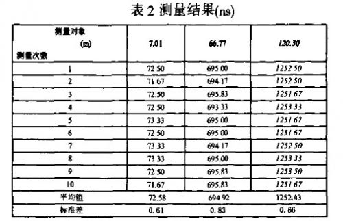 由關(guān)系式(2)可知,對(duì)已知材料的電纜,電纜長(zhǎng)度L與發(fā)射脈沖與反射脈沖間時(shí)間間隔Δt成正比。通過(guò)對(duì)已知長(zhǎng)度的電纜發(fā)射脈沖與反射脈沖的時(shí)間間隔進(jìn)行測(cè)量,可以對(duì)時(shí)間間隔測(cè)量模塊的特性進(jìn)行驗(yàn)證。本文對(duì)長(zhǎng)7.01m,66.77m和120.30m的電纜分別進(jìn)行多次測(cè)量,測(cè)量結(jié)果如表2所示。