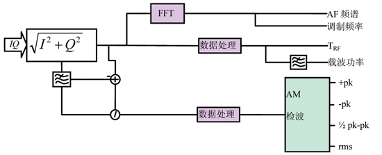 對應(yīng)內(nèi)存中的IQ信號,可以采用的處理方法有:幅度分析、頻率分析、相位分析和FFT頻譜分析。在頻譜儀的矢量分析過程中,頻譜儀設(shè)置為零SPAN,也就是在固定輸入頻率處,中頻帶寬之內(nèi)進行分析。