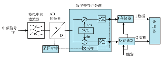 輸入頻譜儀的射頻信號經(jīng)過混頻后變?yōu)橹蓄l信號IF,再經(jīng)過帶通濾波器(中頻濾波器)進入A/D轉(zhuǎn)換器。在數(shù)字處理部分,對下變頻為基帶的IQ信號進行低通濾波和欠采樣,存儲在內(nèi)存中,準備進一步處理,存儲的數(shù)據(jù)表述IQ信號的電壓值。