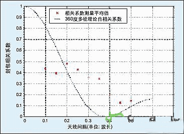 利用所開(kāi)發(fā)的硬件測(cè)試平臺(tái)進(jìn)行了廣泛的測(cè)量,包括手機(jī)分集測(cè)量、天線(xiàn)間隔和操作員身體對(duì)分集的影響、自適應(yīng)波束形成、到達(dá)角、信道互易驗(yàn)證,以及寬帶向量信道測(cè)量。圖5和圖6給出了戶(hù)外非直線(xiàn)可視信道的采樣分集測(cè)量。圖5對(duì)比相對(duì)于天線(xiàn)間隔的相關(guān)系數(shù),注意到當(dāng)相關(guān)性遠(yuǎn)低于0.7時(shí)將十分有利于提高分集性能。圖6給出了分集增益與天線(xiàn)間隔的函數(shù)關(guān)系:99%可靠性時(shí),增益約9dB;90%可靠性時(shí),增益約5-dB。當(dāng)間隔降至0.1波長(zhǎng)時(shí),幾乎沒(méi)有關(guān)聯(lián)關(guān)系了。