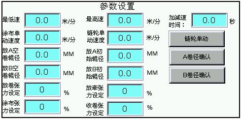 主畫面反映了全部傳動軸的運(yùn)行狀態(tài)、當(dāng)前放卷卷徑、線速度,以及各個擺桿的張力角度位置等,如圖3所示。參數(shù)設(shè)置界面提供了一些工藝參數(shù)數(shù)據(jù)等,如圖4所示。
