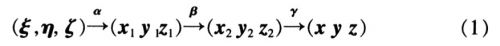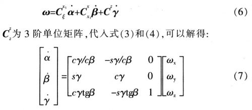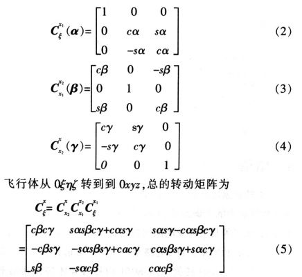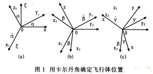 在對剛體的轉(zhuǎn)動運(yùn)動進(jìn)行解析描述時.常應(yīng)用歐拉角或卡爾丹角??柕そ沁m用于姿態(tài)角變化較小的場合,因此.用卡爾丹角進(jìn)行描述。取初始時刻飛行體坐標(biāo)系Oξηζ為固定坐標(biāo)系,0xyz為與飛行體固結(jié)的動坐標(biāo)系??柕そ沁x取的方法是,首先繞ξ軸轉(zhuǎn)過α角,到達(dá)0x1y1zl的位置;再繞y1軸轉(zhuǎn)動β角,到達(dá)0x2y2z2的位置;再繞z2軸轉(zhuǎn)動γ角,到達(dá)0xyz的位置。轉(zhuǎn)動關(guān)系如圖l所示。