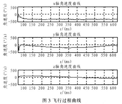 存儲測試系統(tǒng)已經(jīng)成功應(yīng)用于某小型飛行體的試驗(yàn),成功獲得了測試數(shù)據(jù)。下面是實(shí)測曲線及其分析,x軸為自轉(zhuǎn)軸,z軸為飛行方向。實(shí)測飛行過程角速度信號如圖3所示,圖3中,3個軸的角速度曲線在70 ms處均有一個小鼓包,為陀螺的加速度效應(yīng)在曲線上的表現(xiàn)。