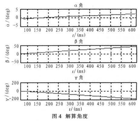 陀螺儀測得的ωx、ωy以及ωz已知,根據(jù)表達(dá)式7所示的運(yùn)動學(xué)微分方程,在MATLAB下解算出角度,如圖4所示。經(jīng)對比,與高速攝影記錄的姿態(tài)非常吻合。