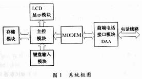 系統(tǒng)框圖見圖1。該系統(tǒng)的核心是主控模塊,主要由微處理器構(gòu)成,控制整個(gè)系統(tǒng)軟硬件的運(yùn)行。一方面處理各部分外圍電路的控制信息,另一方面完成接收和需要發(fā)送的信息的智能化處理,其功能具備可擴(kuò)展性,為以后功能進(jìn)一步加強(qiáng)保留軟件接口;存儲(chǔ)模塊包括外部RAM、EPROM存儲(chǔ)器和相應(yīng)的掉電保護(hù)電路,用于存放系統(tǒng)運(yùn)行中需要處理、交換的數(shù)據(jù),同時(shí)還用于存儲(chǔ)接收到的或需要發(fā)送的數(shù)據(jù)信息;EPROM主要用于存放系統(tǒng)軟件及存放漢字字庫(kù);鍵盤輸入模塊用于接收來(lái)自用戶的輸入數(shù)據(jù),包括控制信息和數(shù)據(jù)信息,它是用戶對(duì)該系統(tǒng)的輸入接口;LCD模塊由LCD顯示器及相關(guān)控制電路組成,可以顯示中文、英文、數(shù)字和各類字符,它是該系統(tǒng)對(duì)用戶的輸出接口。MODEM模塊由一片嵌入式MODEM芯片及相關(guān)外圍電路組成。一方面用于調(diào)制由主控模塊送來(lái)的數(shù)據(jù),將數(shù)字信息轉(zhuǎn)化為模擬信號(hào),送入前端電話接口模塊DAA電路;另一方面將DAA電路接收的模擬信號(hào)轉(zhuǎn)化為數(shù)字信號(hào),并交給主控模塊進(jìn)一步處理。它是所有信息的進(jìn)出口,起著至關(guān)重要的作用。