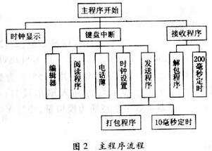 電話終端的核心是MCS-89C52微處理器。通常情況下,微處理器工作在低功耗方式,當(dāng)有鍵按下時(shí),退出低功耗模式,進(jìn)入主菜單。在主菜單中,用戶可以選擇操作。為減少冗余代碼,軟件采用匯編語(yǔ)言編寫,字庫(kù)固化在外部擴(kuò)展的EPROM中,內(nèi)部EPROM存放程序。圖2為主程序流程。