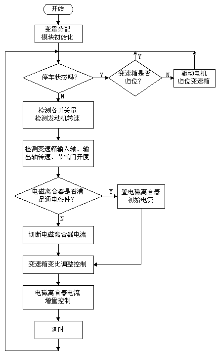TCU控制系統(tǒng)主程序框圖如圖3所示。程序首先對內部RAM進行分配,然后對各功能模塊如Administrator/D轉換器、定時器、PWM波形發(fā)生器等進行初始化。變速箱的變比在汽車每次時應處于最小變比的位置,因此在每次停車時應將變速箱歸位,汽車起動后首先檢測各參數(shù),如檔位開關、發(fā)動機轉速、節(jié)氣門開度、變速箱輸入、輸出軸轉速等。這些參數(shù)是控制電磁離合器電流和電動機狀態(tài)的依據(jù)。當需要增加變速箱的變比時,TCU控制電機正轉,反之控制電機反轉。電磁離合器的控制采用電流增量控制方式。它的控制好壞,直接影響汽車運行的平穩(wěn)性和經濟性。