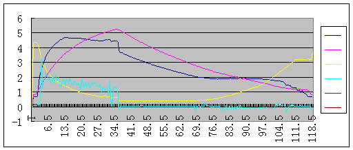 圖4和圖5為汽車實際運行時電磁離合器電流和變速箱變比的關系曲線。其中圖4為汽車速度從零急加速到120KM/H,到120KM/H后松開油門減速到零時的電磁離合器電流與發(fā)動機轉速、節(jié)氣門開度和輸入軸轉速之間的曲線圖。由圖可以看出節(jié)氣門急加到最大后保持一段時間,電磁離合器電流同步緊跟著加,當加到峰值時,繼續(xù)保持不變,發(fā)動機轉速也加到一個值保持不變,從圖中還可看出電磁離合器電流在增加的過程中,不斷在抖動,可知在上升過程中電磁離合器在不斷在打滑,在此段時間內發(fā)動機轉速與輸入軸轉速不成比例,直到電磁離合器到一個穩(wěn)定的值后才保持一定的比例關系。當節(jié)氣門全松開后,電磁離合器電流隨之下降到一個小值后保持不變,直到車速達到使變速箱處于由齒輪變速為主時,電磁離合器電流繼續(xù)減小,當車速為零時,電磁離合器電流隨之減小到零。由圖4可知,當車速在從零加到120KM/H,電磁離合器電流為零,輸入軸轉速也慢慢減為零。在整個過程中,我們可看到,節(jié)氣門開度變化率代表了駕駛員的意圖,電磁離合器電流主要由節(jié)氣門開度來決定。電磁離合器的打滑程度決定了發(fā)動機轉速和輸入軸轉速的之間的傳輸比例關系。