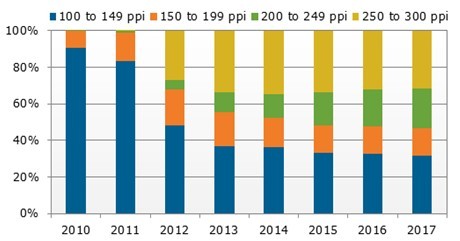 隨著市場發(fā)展,平板電腦本身規(guī)格也不斷地的進步。更高的像素將使平板電腦將具有理想多媒體體驗。在接下來幾個季度,面板的分辨率和像素將進一步提高;我們預(yù)估,2012年200-300ppi像素的滲透率將達30%,到了2017年可達到47.5%。