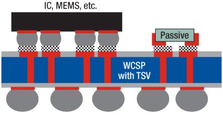 隨著 WCSP 的發(fā)展,我們將見證 TSV 互連技術的融合,其提供有源端到裸片后端的電氣連接。這種能力允許 IC 或者其他組件(MEMS、無源組件等)堆疊,從而構建起高集成度的芯片組或者系統(tǒng)級封裝 (SiP) 系統(tǒng)。