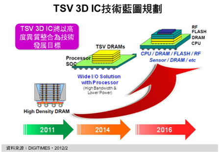 綜合各主要芯片制造商技術(shù)藍(lán)圖規(guī)畫(huà),2011年TSV 3D IC是以同質(zhì)整合的高容量DRAM產(chǎn)品為主,至2014年,除將以多顆DRAM堆棧外,尚會(huì)整合一顆中央處理器或應(yīng)用處理器的異質(zhì)整合產(chǎn)品。柴煥欣也預(yù)估,要至2016年,才有機(jī)會(huì)達(dá)到將DRAM、RF、NAND Flash、CPU等各種不同的半導(dǎo)體組件以TSV 3D IC技術(shù)整合于同1顆IC之中異質(zhì)整合水平。