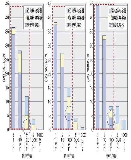 圖2:大容量產(chǎn)品的所占比例按照不同的靜電容量對電容器的總需求進(jìn)行了統(tǒng)計(jì),分別明確了片狀獨(dú)石陶瓷電容器、鋁電解電容器、鉭電解電容器各自所占比例?!?/p>