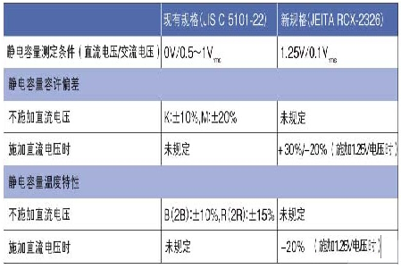 在靜電容量的測定上,新規(guī)格改為在施加1.25V直流電壓和0.1Vrms交流電壓的狀態(tài)下對容量進(jìn)行測定。而原來的“JIS C 5101-22”規(guī)格并不要求施加直流電壓,只是要求在施加0.5~1Vrms交流電壓的狀態(tài)下對容量進(jìn)行測定?! ?br />